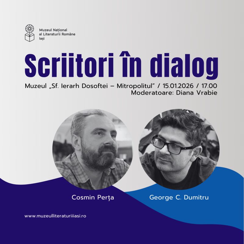 Joi, 15 ianuarie 2026, cu începere de la ora 17.00, la Muzeul „Sf. Ierarh Dosoftei – Mitropolitul” va avea loc o întâlnire cu scriitorii Cosmin Perța și George C. Dumitru.