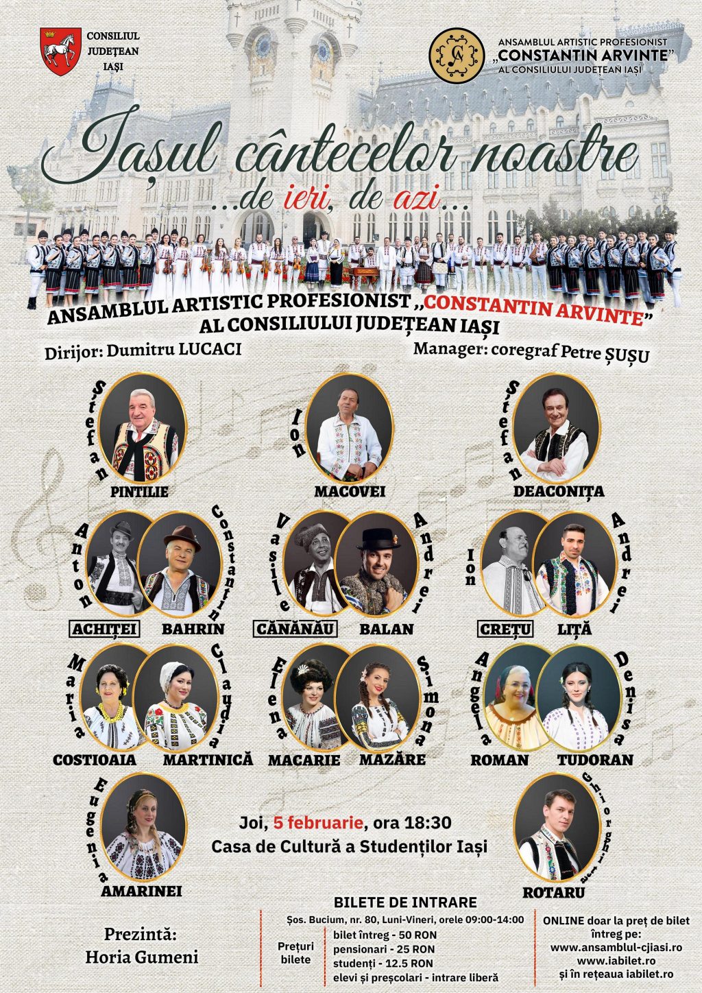 Ansamblul Artistic Profesionist „Constantin Arvinte” al Consiliului Județean Iași propune un spectacol dedicat cântecului moldovenesc din zona etnofolclorică Iași, cu artiști îndrăgiți și momente pline de emoție.
