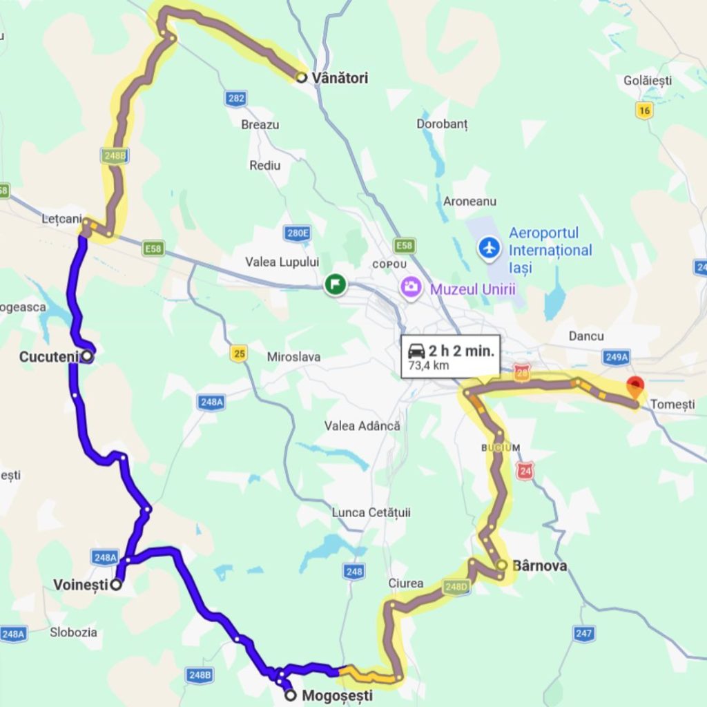 Traseu: DJ 248B Vânători (DN24) – Horlești – Bogonos – Lețcani (DN28).
